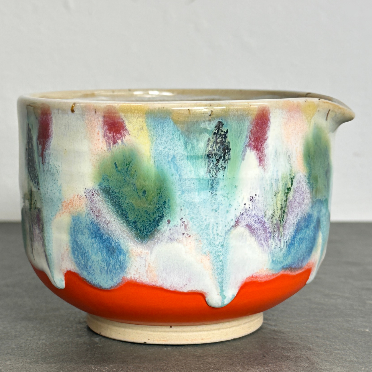 Auf der Töpferscheibe gedrehte Steinzeugchawan aus hellem Ton mit Spots, glasiert und bei über 1200 Grad Celsius gebrannt. Jedes Stück ist ein Unikat – hergestellt in aufwändiger Handarbeit und bis ins kleinste Detail perfektioniert. Handwäsche empfohlen. Innenglasur: weiß glänzend. Alle verwendeten Glasuren sind essgeschirrgeeignet, für meine Produkte verwende ich ausschließlich Glasuren, die explizit für den Kontakt mit Lebensmitteln produziert worden sind. Fassungsvermögen: 500 Milliliter. Die Chawan ist eine japanische Teeschale, die speziell für das Aufschäumen und Trinken von Matcha entwickelt wurde. Ihre Form sorgt dafür, dass sich Matcha-Pulver und Wasser optimal verbinden und ein cremiger, gleichmäßiger Schaum entsteht. Die Form der Chawan ist harmonisch rund, leicht bauchig und steht stabil auf einem dezent abgesetzten Fuß. Ein einzigartiges Unikat, das sowohl funktional als auch visuell beeindruckt.