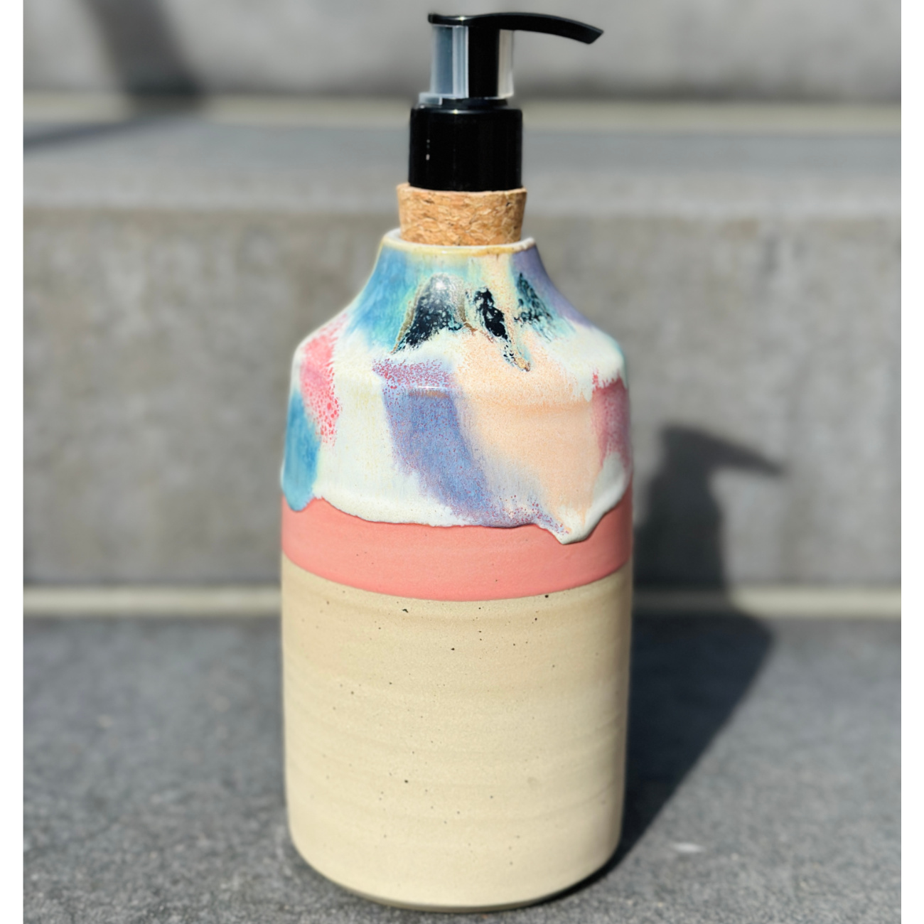 Auf der Töpferscheibe gedrehter Seifenspender aus hellem Ton mit Spots, glasiert und bei über 1200 Grad Celsius gebrannt. Jedes Stück ist ein Unikat – hergestellt in aufwändiger Handarbeit und bis ins kleinste Detail perfektioniert. Handwäsche empfohlen. Dieser einzigartige Seifenspender vereint schlichte Eleganz mit künstlerischem Flair. Der untere Teil besticht durch eine glatte, naturbelassene Oberfläche mit feinen Spots, während der obere Rand mit einer auffälligen, mehrfarbigen Glasur veredelt ist. Diese Vase  bringt Farbe und Stil in jedes Badezimmer.