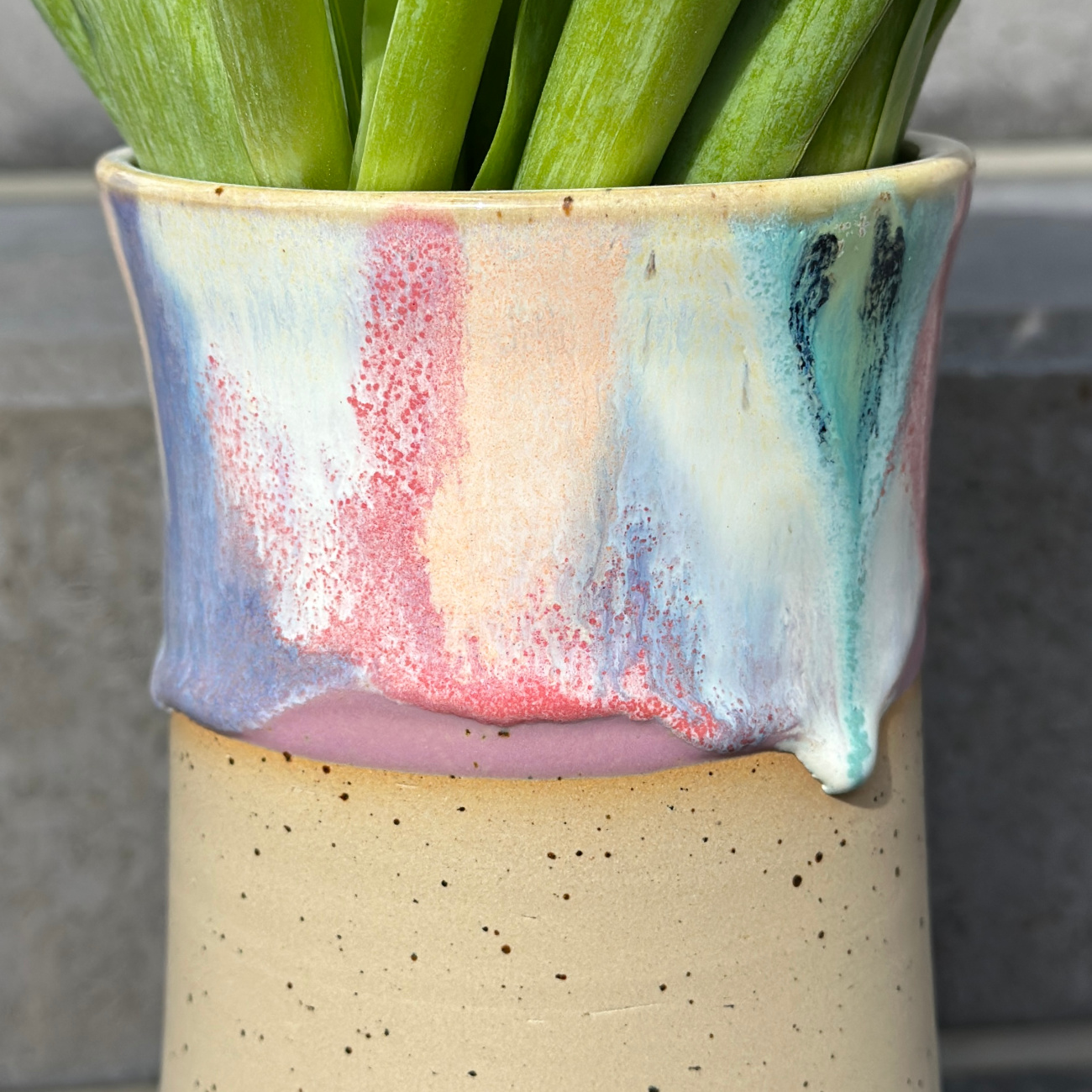 Auf der Töpferscheibe gedrehte Steinzeugvase aus hellem Ton mit Spots, glasiert und bei über 1200 Grad Celsius gebrannt. Jedes Stück ist ein Unikat – hergestellt in aufwändiger Handarbeit und bis ins kleinste Detail perfektioniert. Handwäsche empfohlen. Diese einzigartige Vase vereint schlichte Eleganz mit künstlerischem Flair. Der untere Teil besticht durch eine glatte, naturbelassene Oberfläche mit feinen Spots, während der obere Rand mit einer auffälligen, mehrfarbigen Glasur veredelt ist. Diese Vase bringt Farbe und Stil in jedes Zuhause – ideal für frische Blumen oder als dekoratives Einzelstück. Höhe: 16 cm.