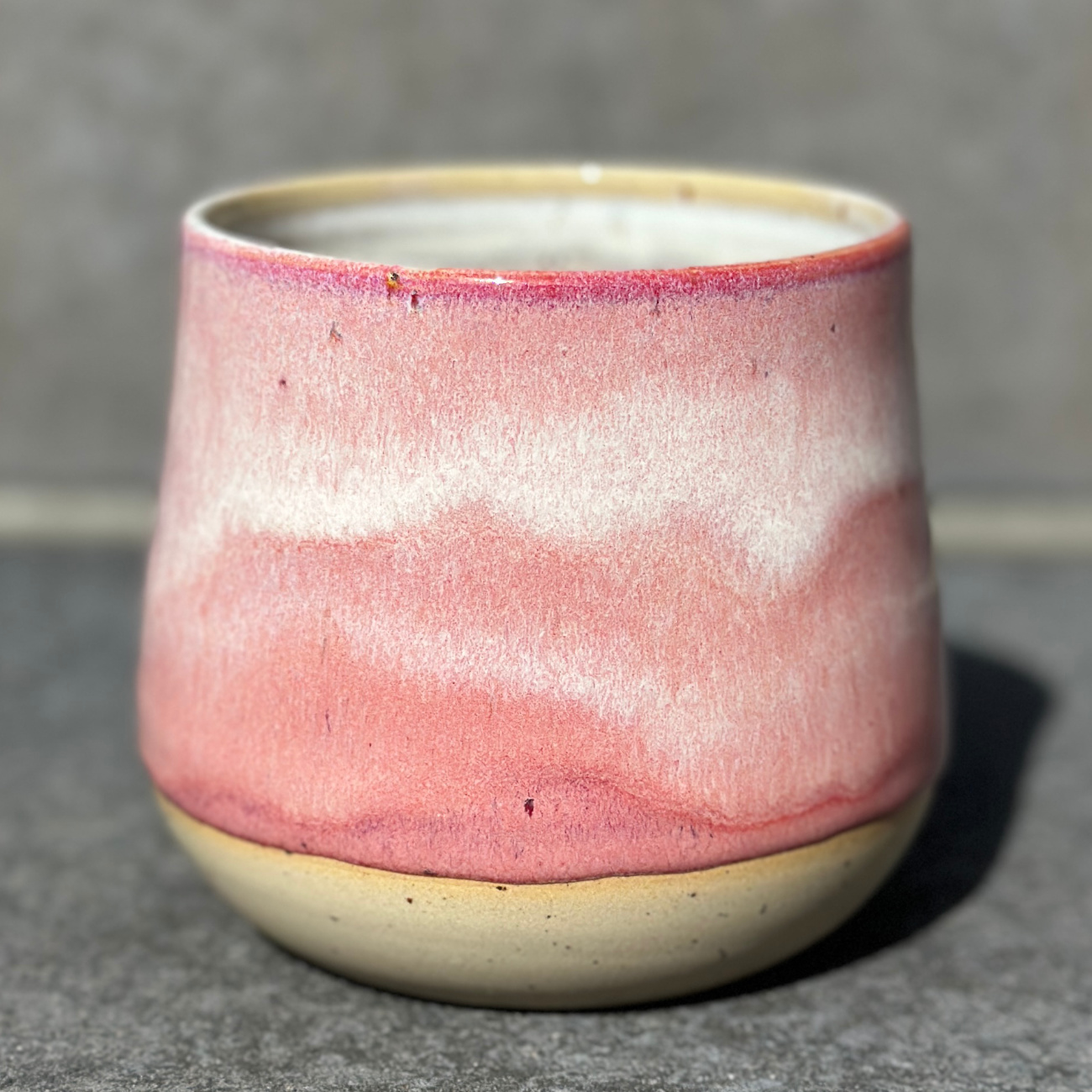 Auf der Töpferscheibe gedrehter Becher aus Steinzeug, glasiert und bei über 1200 Grad Celsius gebrannt. Jedes Stück ist ein Unikat – hergestellt in aufwändiger Handarbeit und bis ins kleinste Detail perfektioniert. Handwäsche empfohlen. Innenglasur: weiß glänzend. Alle verwendeten Glasuren sind essgeschirrgeeignet, für meine Produkte verwende ich ausschließlich Glasuren, die explizit für den Kontakt mit Lebensmitteln produziert worden sind. Das Fassungsvermögen der Cups liegt bei 350 bis 400 Millilitern. Die Cups der Glasurenkollektion weichen voneinander leicht in Form und Größe ab.