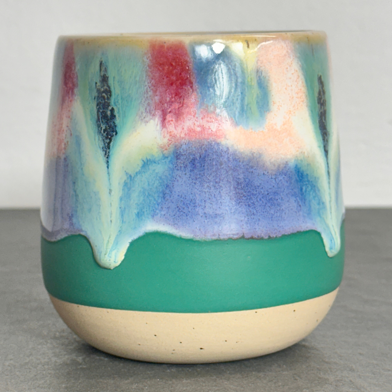 Auf der Töpferscheibe gedrehter Steinzeugbecher aus hellem Ton mit Spots, glasiert und bei über 1200 Grad Celsius gebrannt. Jedes Stück ist ein Unikat – hergestellt in aufwändiger Handarbeit und bis ins kleinste Detail perfektioniert. Handwäsche empfohlen. Innenglasur: weiß glänzend. Alle verwendeten Glasuren sind essgeschirrgeeignet, für meine Produkte verwende ich ausschließlich Glasuren, die explizit für den Kontakt mit Lebensmitteln produziert worden sind. Das Fassungsvermögen der Cups liegt bei rund 350 Millilitern. Die Cups der Glasurenkollektion weichen voneinander leicht in Form und Größe ab.