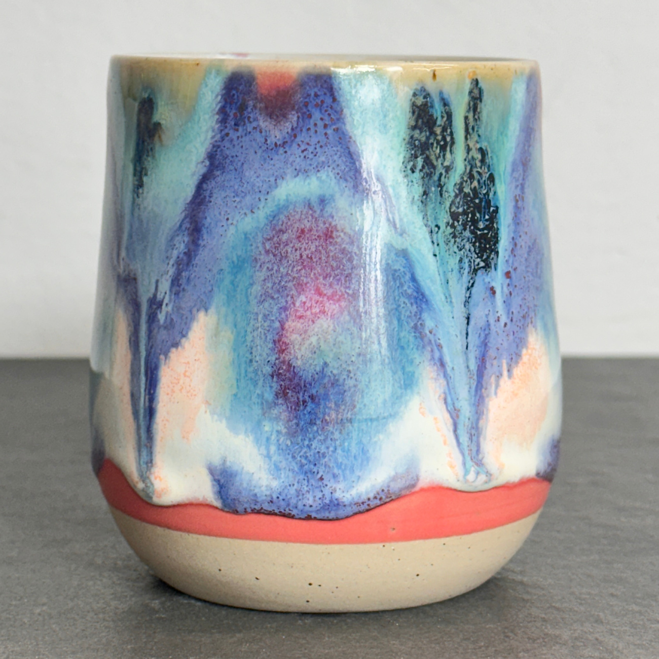 Auf der Töpferscheibe gedrehter Steinzeugbecher aus hellem Ton mit Spots, glasiert und bei über 1200 Grad Celsius gebrannt. Jedes Stück ist ein Unikat – hergestellt in aufwändiger Handarbeit und bis ins kleinste Detail perfektioniert. Handwäsche empfohlen. Innenglasur: weiß glänzend. Alle verwendeten Glasuren sind essgeschirrgeeignet, für meine Produkte verwende ich ausschließlich Glasuren, die explizit für den Kontakt mit Lebensmitteln produziert worden sind. Das Fassungsvermögen der Cups liegt bei rund 350 Millilitern. Die Cups der Glasurenkollektion weichen voneinander leicht in Form und Größe ab.
