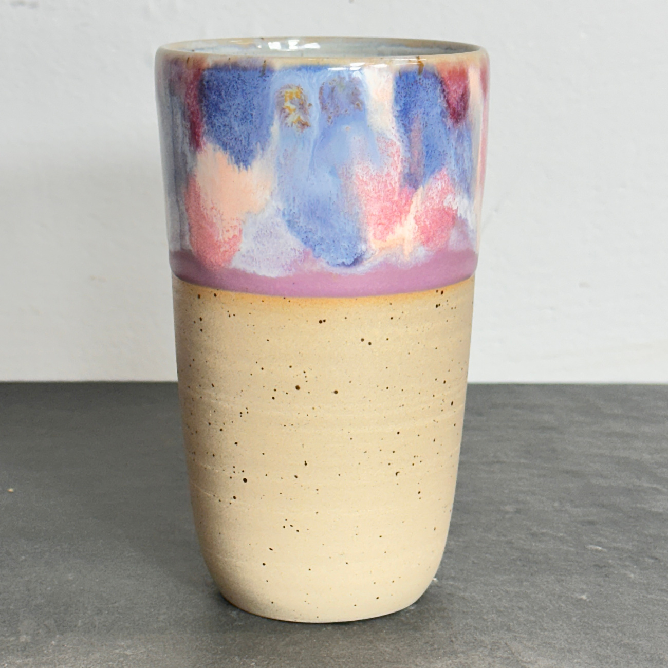 Auf der Töpferscheibe gedrehter Steinzeugbecher aus hellem Ton mit Spots, glasiert und bei über 1200 Grad Celsius gebrannt. Jedes Stück ist ein Unikat – hergestellt in aufwändiger Handarbeit und bis ins kleinste Detail perfektioniert. Handwäsche empfohlen. Innenglasur: weiß glänzend. Alle verwendeten Glasuren sind essgeschirrgeeignet, für meine Produkte verwende ich ausschließlich Glasuren, die explizit für den Kontakt mit Lebensmitteln produziert worden sind. Fassungsvermögen: gut 600 Milliliter. Die Cups der Glasurenkollektion weichen voneinander leicht in Form und Größe ab.