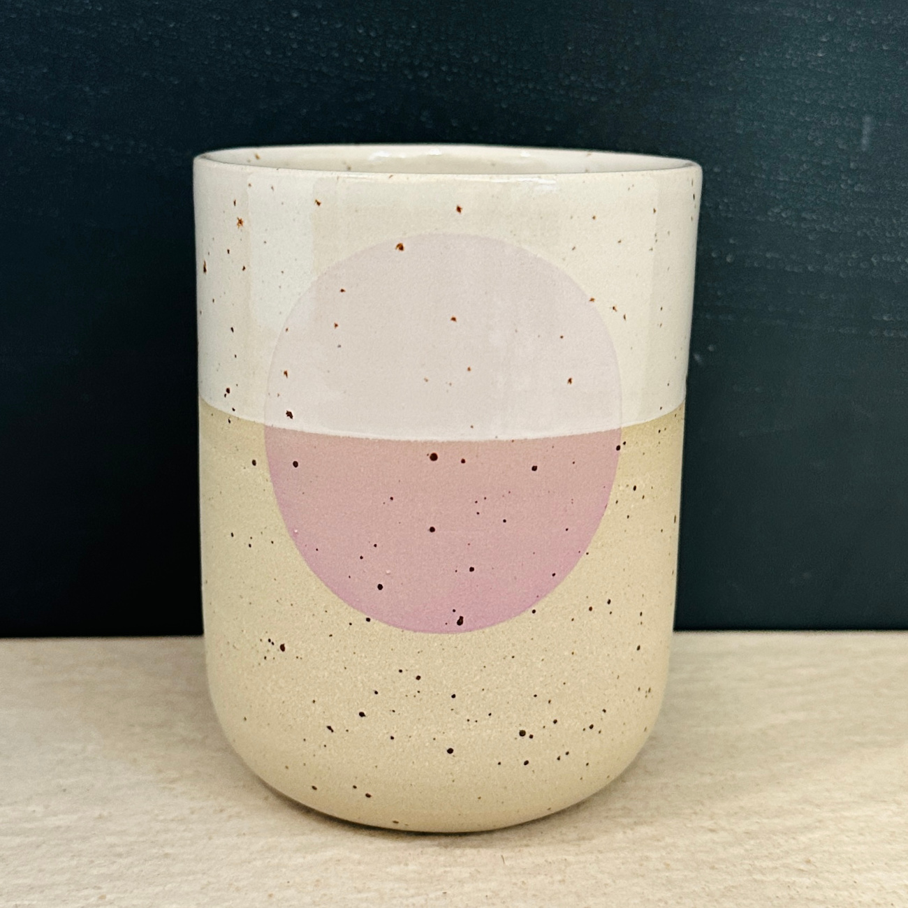 Auf der Töpferscheibe gedrehter Steinzeugbecher, glasiert und bei über 1200 Grad Celsius gebrannt. Handwäsche empfohlen. Innenglasur: weiß glänzend. Alle verwendeten Glasuren sind essgeschirrgeeignet, für meine Produkte verwende ich ausschließlich Glasuren, die explizit für den Kontakt mit Lebensmitteln produziert worden sind. Fassungsvermögen: In etwa 350 Milliliter. Die Becher der Dotkollektion können untereinander in Form und Größe leicht abweichen.