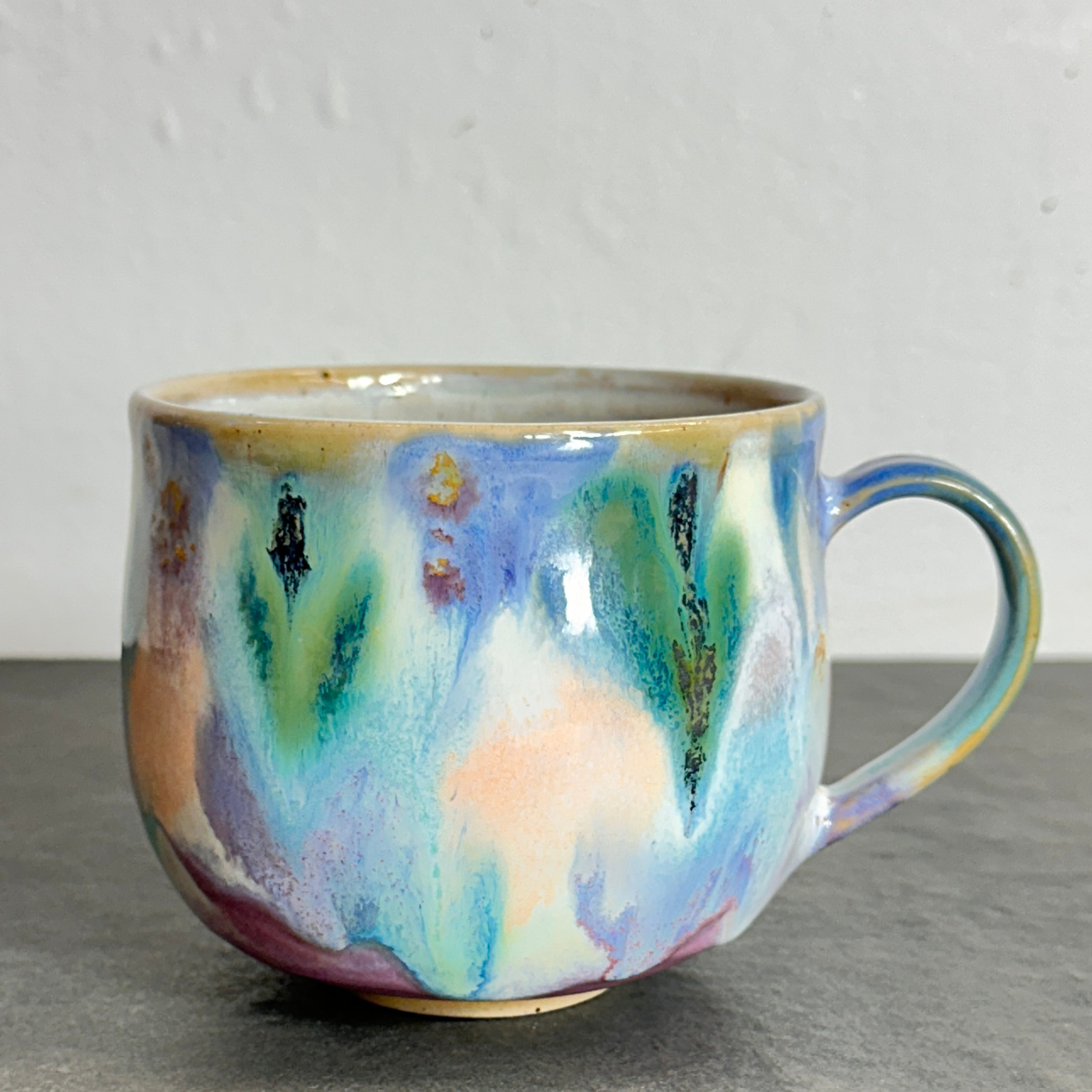 Auf der Töpferscheibe gedrehte Steinzeugtasse aus hellem Ton mit Spots, glasiert und bei über 1200 Grad Celsius gebrannt. Jedes Stück ist ein Unikat – hergestellt in aufwändiger Handarbeit und bis ins kleinste Detail perfektioniert. Handwäsche empfohlen. Innenglasur: weiß glänzend. Alle verwendeten Glasuren sind essgeschirrgeeignet, für meine Produkte verwende ich ausschließlich Glasuren, die explizit für den Kontakt mit Lebensmitteln produziert worden sind. Fassungsvermögen: 650 Milliliter. Die Tassen der Glasurenkollektion weichen voneinander in Form und Größe ab.