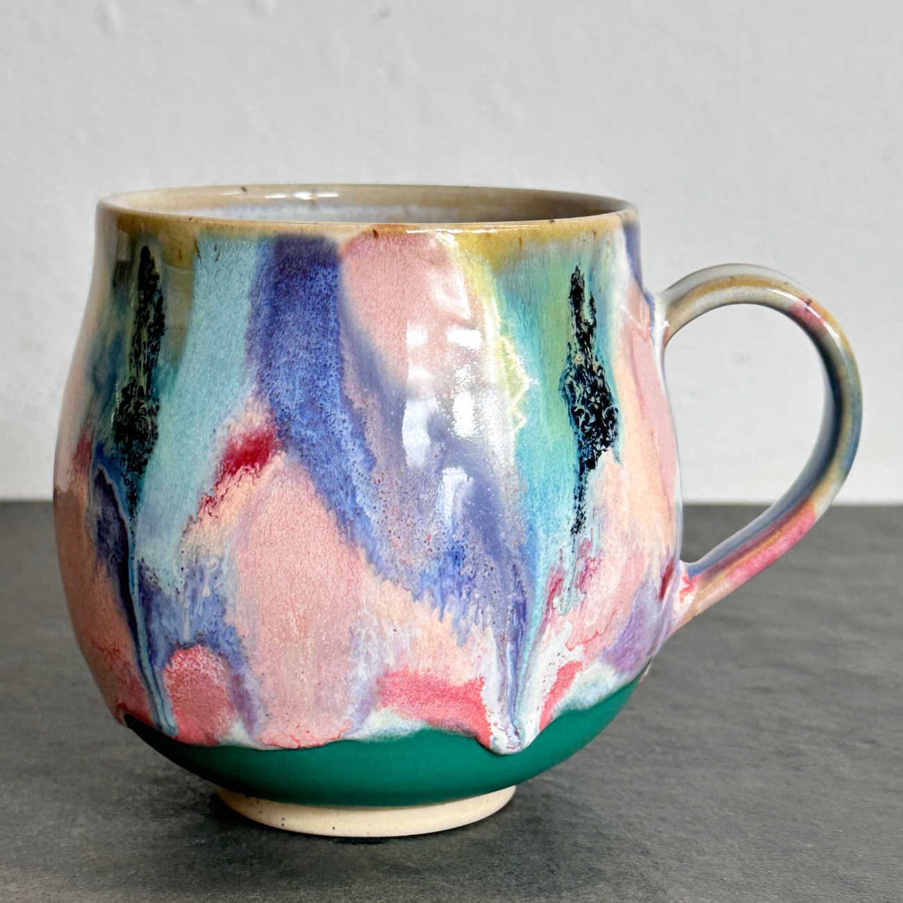 Auf der Töpferscheibe gedrehte Steinzeugtasse aus hellem Ton mit Spots, glasiert und bei über 1200 Grad Celsius gebrannt. Jedes Stück ist ein Unikat – hergestellt in aufwändiger Handarbeit und bis ins kleinste Detail perfektioniert. Handwäsche empfohlen. Innenglasur: weiß glänzend. Alle verwendeten Glasuren sind essgeschirrgeeignet, für meine Produkte verwende ich ausschließlich Glasuren, die explizit für den Kontakt mit Lebensmitteln produziert worden sind. Fassungsvermögen: 620 Milliliter. Die Tassen der Glasurenkollektion weichen voneinander in Form und Größe ab.