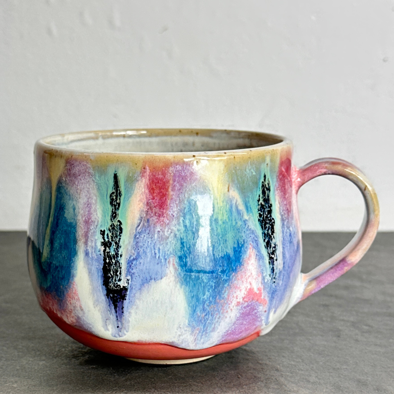 Auf der Töpferscheibe gedrehte Steinzeugtasse aus hellem Ton mit Spots, glasiert und bei über 1200 Grad Celsius gebrannt. Jedes Stück ist ein Unikat – hergestellt in aufwändiger Handarbeit und bis ins kleinste Detail perfektioniert. Handwäsche empfohlen. Innenglasur: weiß glänzend. Alle verwendeten Glasuren sind essgeschirrgeeignet, für meine Produkte verwende ich ausschließlich Glasuren, die explizit für den Kontakt mit Lebensmitteln produziert worden sind. Fassungsvermögen: 600 Milliliter. Die Tassen der Glasurenkollektion weichen voneinander in Form und Größe ab.