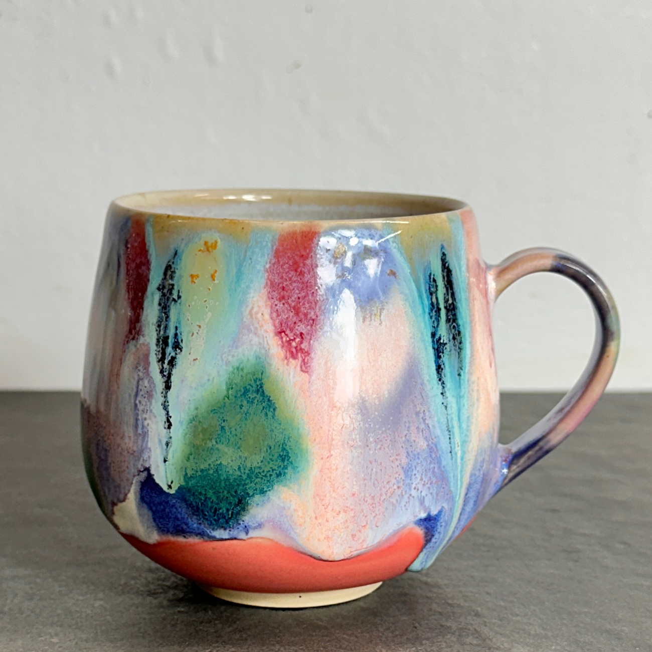 Auf der Töpferscheibe gedrehte Steinzeugtasse aus hellem Ton mit Spots, glasiert und bei über 1200 Grad Celsius gebrannt. Jedes Stück ist ein Unikat – hergestellt in aufwändiger Handarbeit und bis ins kleinste Detail perfektioniert. Handwäsche empfohlen. Innenglasur: weiß glänzend. Alle verwendeten Glasuren sind essgeschirrgeeignet, für meine Produkte verwende ich ausschließlich Glasuren, die explizit für den Kontakt mit Lebensmitteln produziert worden sind. Fassungsvermögen: 600 Milliliter. Die Tassen der Glasurenkollektion weichen voneinander in Form und Größe ab.