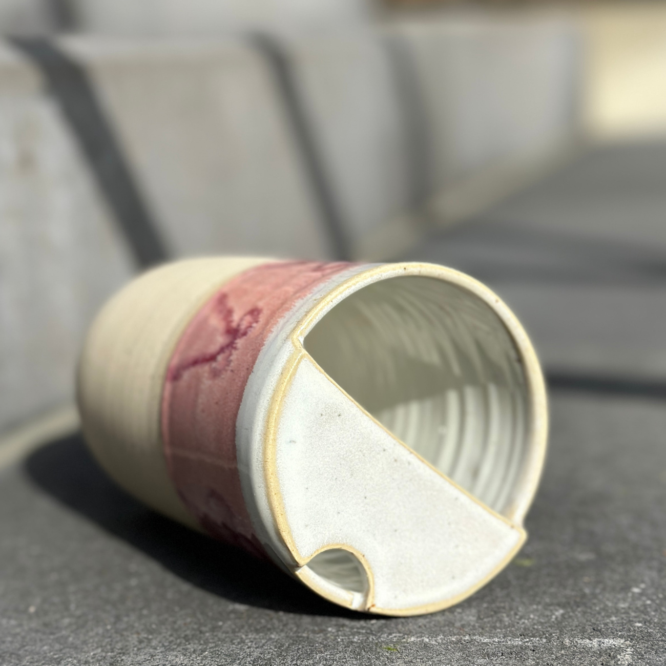 Auf der Töpferscheibe gedrehter Becher aus Steinzeug, glasiert und bei über 1200 Grad Celsius gebrannt. Jedes Stück ist ein Unikat – hergestellt in aufwändiger Handarbeit und bis ins kleinste Detail perfektioniert. Handwäsche empfohlen. Innenglasur: weiß glänzend. Alle verwendeten Glasuren sind essgeschirrgeeignet, für meine Produkte verwende ich ausschließlich Glasuren, die explizit für den Kontakt mit Lebensmitteln produziert worden sind. Das Fassungsvermögen des Travel-Cups liegt bei gut 580 Millilitern. Die Cups der Glasurenkollektion weichen voneinander leicht in Form und Größe ab.