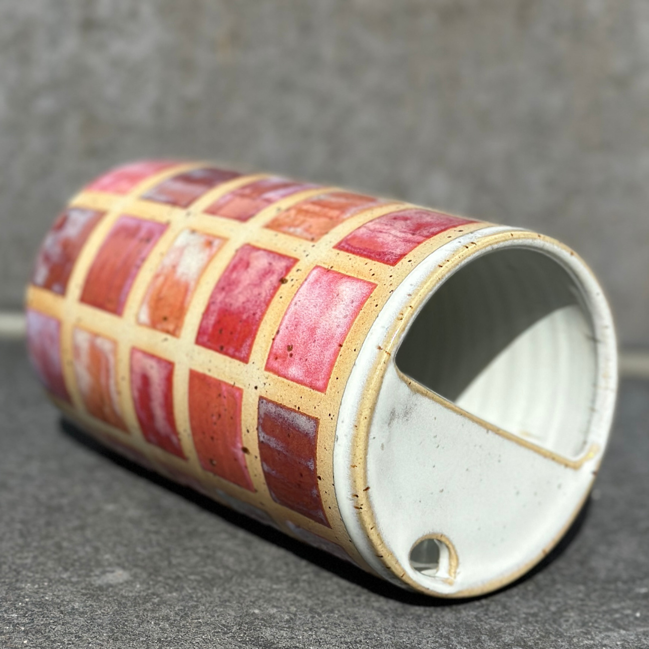 Auf der Töpferscheibe gedrehter Becher aus Steinzeug, glasiert und bei über 1200 Grad Celsius gebrannt. Jedes Stück ist ein Unikat – hergestellt in aufwändiger Handarbeit und bis ins kleinste Detail perfektioniert. Handwäsche empfohlen. Innenglasur: weiß glänzend. Alle verwendeten Glasuren sind essgeschirrgeeignet, für meine Produkte verwende ich ausschließlich Glasuren, die explizit für den Kontakt mit Lebensmitteln produziert worden sind. Das Fassungsvermögen des Travel-Cups liegt bei gut 600 Millilitern. Die Cups der Glasurenkollektion weichen voneinander leicht in Form und Größe ab.
