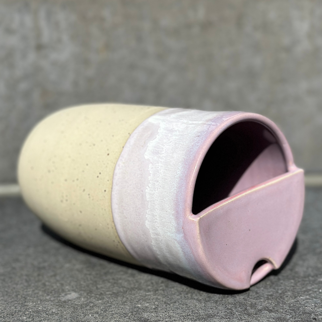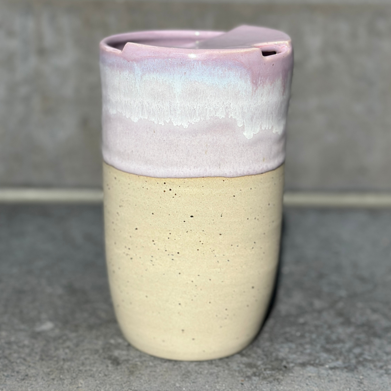 Auf der Töpferscheibe gedrehter Becher aus Steinzeug, glasiert und bei über 1200 Grad Celsius gebrannt. Jedes Stück ist ein Unikat – hergestellt in aufwändiger Handarbeit und bis ins kleinste Detail perfektioniert. Handwäsche empfohlen. Innenglasur: weiß glänzend. Alle verwendeten Glasuren sind essgeschirrgeeignet, für meine Produkte verwende ich ausschließlich Glasuren, die explizit für den Kontakt mit Lebensmitteln produziert worden sind. Das Fassungsvermögen des Travel-Cups liegt bei gut 600 Millilitern. Die Cups der Glasurenkollektion weichen voneinander leicht in Form und Größe ab.