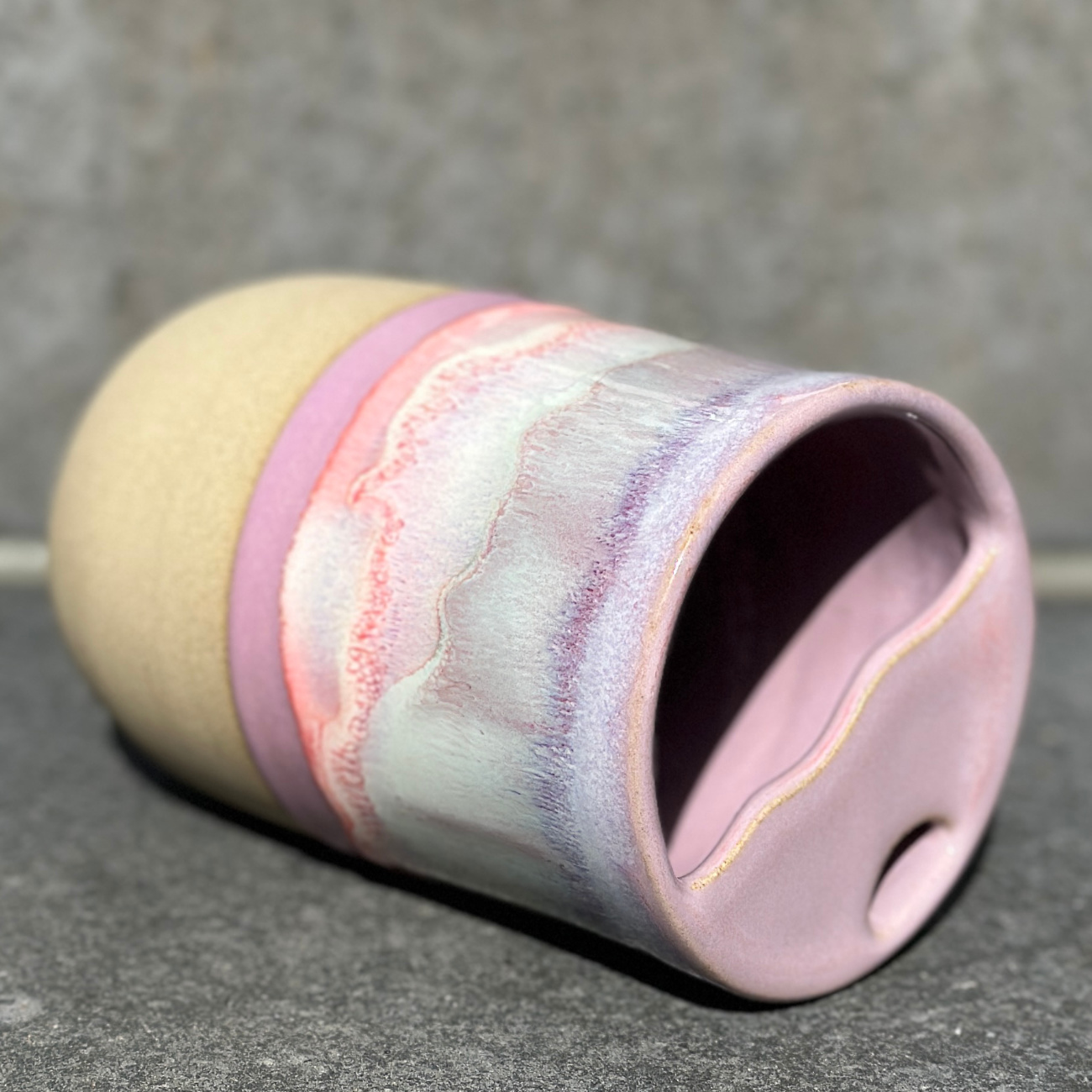 Auf der Töpferscheibe gedrehter Becher aus Steinzeug, glasiert und bei über 1200 Grad Celsius gebrannt. Jedes Stück ist ein Unikat – hergestellt in aufwändiger Handarbeit und bis ins kleinste Detail perfektioniert. Handwäsche empfohlen. Innenglasur: weiß glänzend. Alle verwendeten Glasuren sind essgeschirrgeeignet, für meine Produkte verwende ich ausschließlich Glasuren, die explizit für den Kontakt mit Lebensmitteln produziert worden sind. Das Fassungsvermögen des Travel-Cups liegt bei gut 500 Millilitern. Die Cups der Glasurenkollektion weichen voneinander leicht in Form und Größe ab.