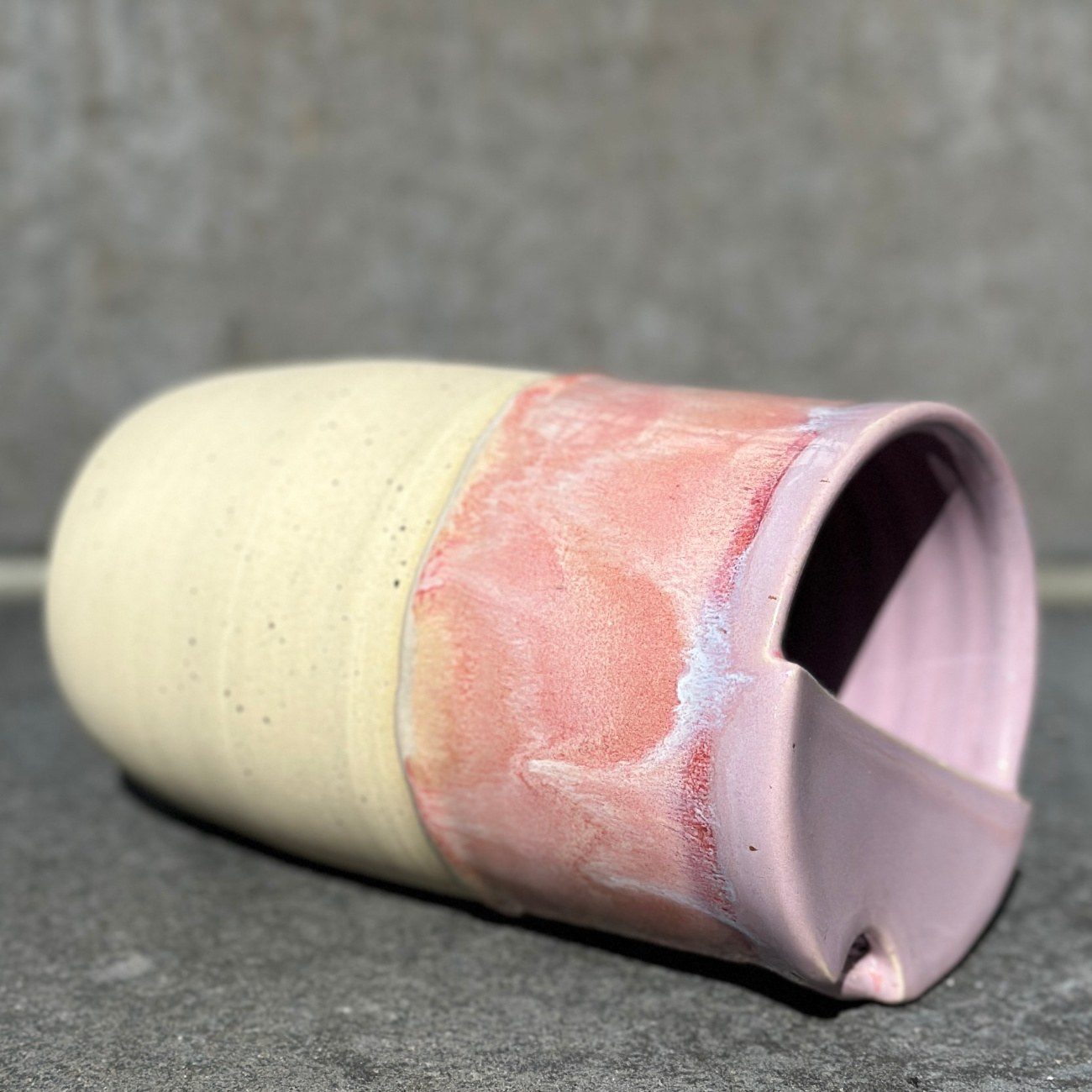 Auf der Töpferscheibe gedrehter Becher aus Steinzeug, glasiert und bei über 1200 Grad Celsius gebrannt. Jedes Stück ist ein Unikat – hergestellt in aufwändiger Handarbeit und bis ins kleinste Detail perfektioniert. Handwäsche empfohlen. Innenglasur: weiß glänzend. Alle verwendeten Glasuren sind essgeschirrgeeignet, für meine Produkte verwende ich ausschließlich Glasuren, die explizit für den Kontakt mit Lebensmitteln produziert worden sind. Das Fassungsvermögen des Travel-Cups liegt bei gut 580 Millilitern. Die Cups der Glasurenkollektion weichen voneinander leicht in Form und Größe ab.