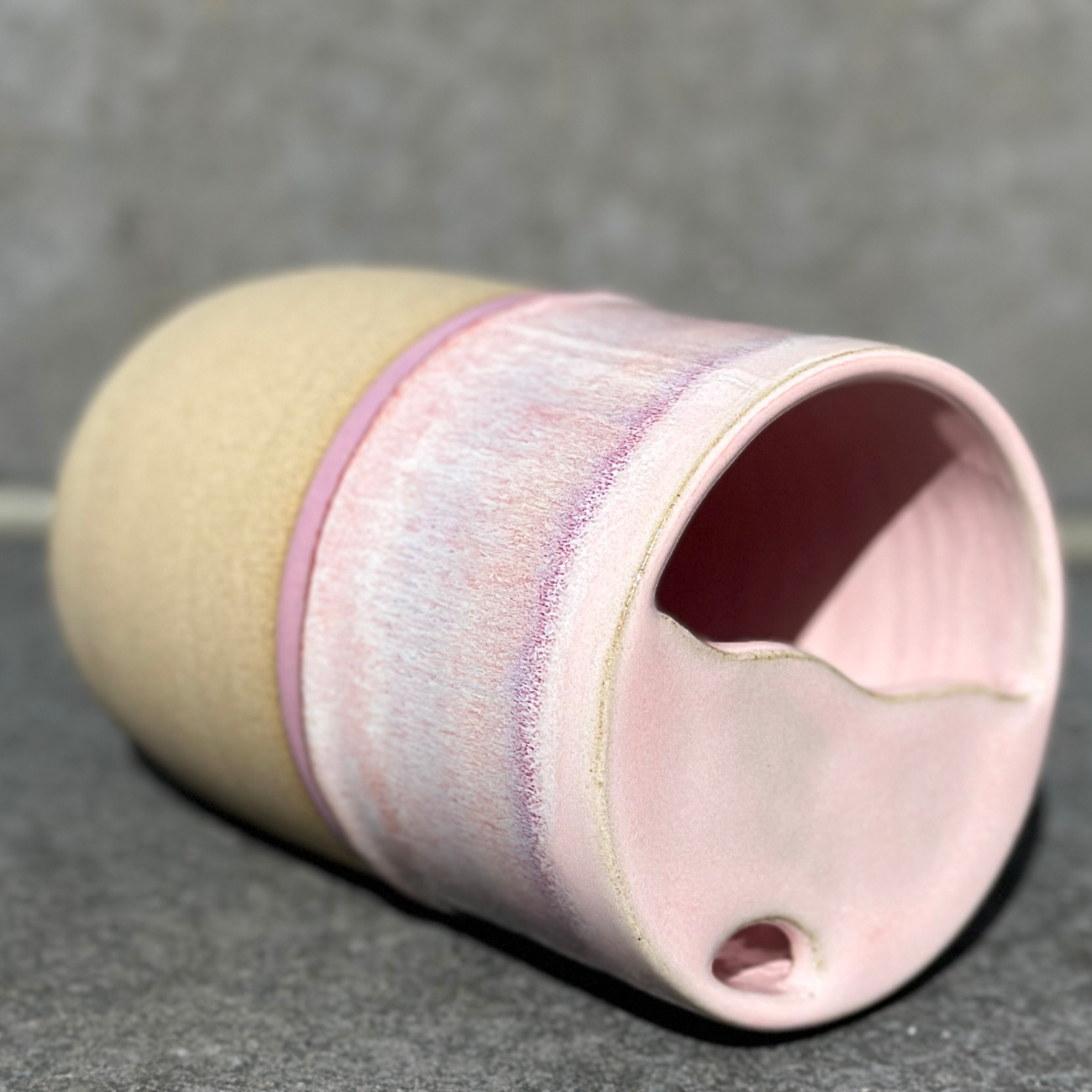 Auf der Töpferscheibe gedrehter Becher aus Steinzeug, glasiert und bei über 1200 Grad Celsius gebrannt. Jedes Stück ist ein Unikat – hergestellt in aufwändiger Handarbeit und bis ins kleinste Detail perfektioniert. Handwäsche empfohlen. Innenglasur: weiß glänzend. Alle verwendeten Glasuren sind essgeschirrgeeignet, für meine Produkte verwende ich ausschließlich Glasuren, die explizit für den Kontakt mit Lebensmitteln produziert worden sind. Das Fassungsvermögen des Travel-Cups liegt bei gut 480 Millilitern. Die Cups der Glasurenkollektion weichen voneinander leicht in Form und Größe ab.
