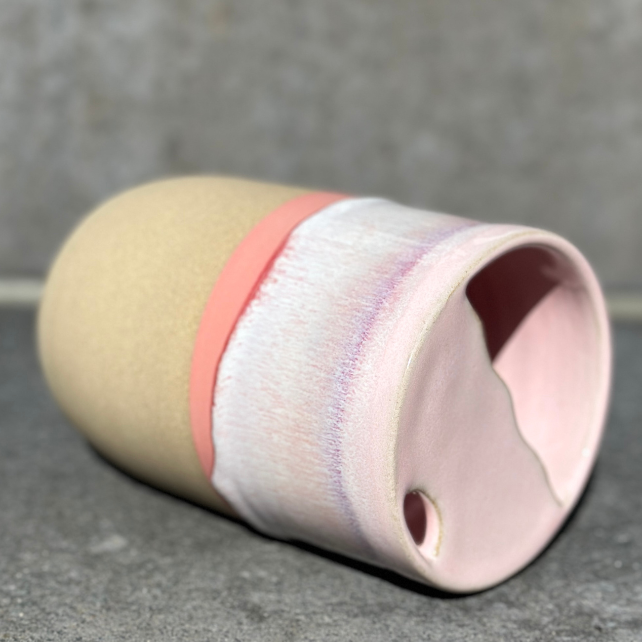 Auf der Töpferscheibe gedrehter Becher aus Steinzeug, glasiert und bei über 1200 Grad Celsius gebrannt. Jedes Stück ist ein Unikat – hergestellt in aufwändiger Handarbeit und bis ins kleinste Detail perfektioniert. Handwäsche empfohlen. Innenglasur: weiß glänzend. Alle verwendeten Glasuren sind essgeschirrgeeignet, für meine Produkte verwende ich ausschließlich Glasuren, die explizit für den Kontakt mit Lebensmitteln produziert worden sind. Das Fassungsvermögen des Travel-Cups liegt bei gut 500 Millilitern. Die Cups der Glasurenkollektion weichen voneinander leicht in Form und Größe ab.
